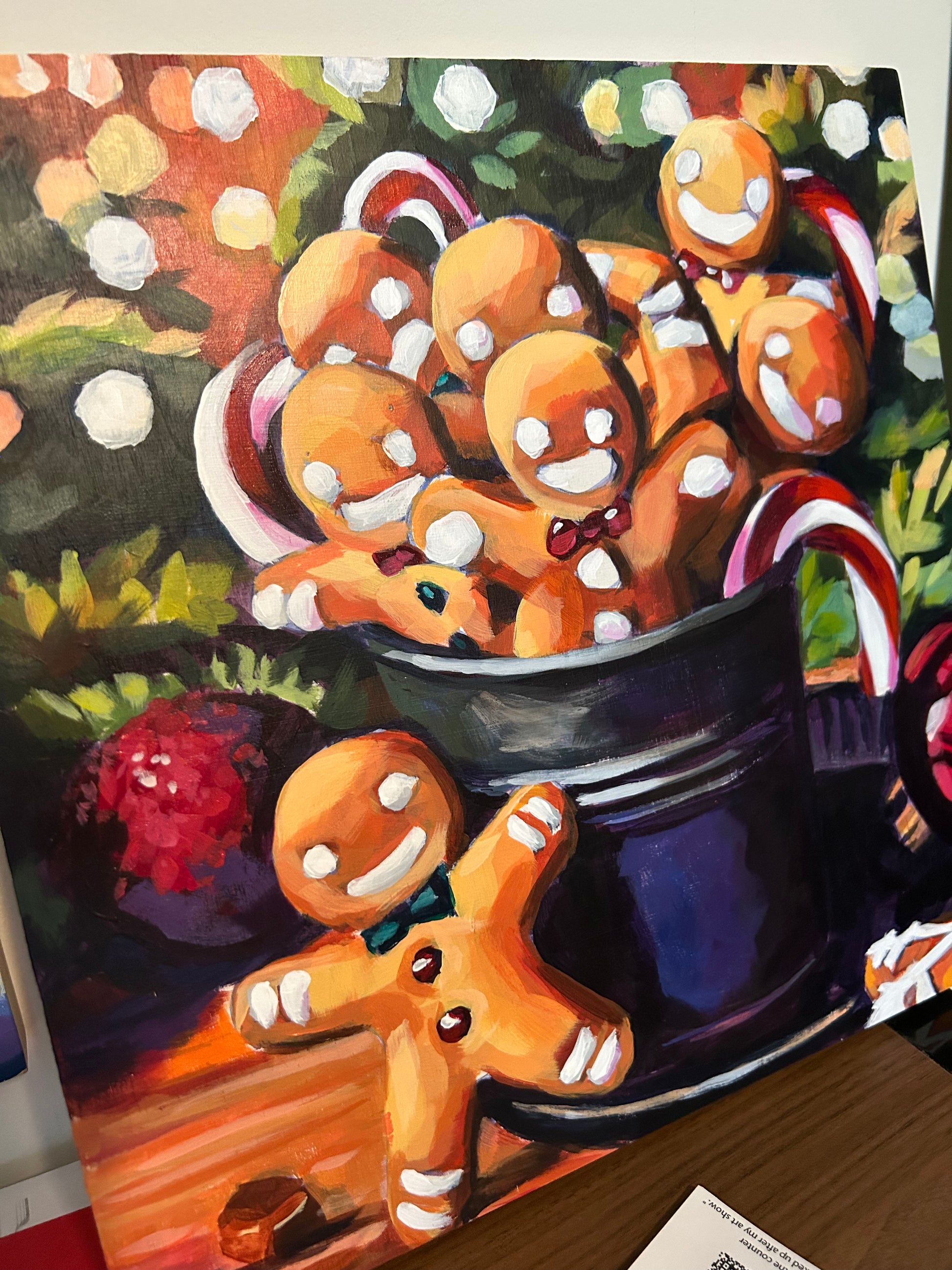 Festive acrylic painting of cheerful gingerbread cookies with candy canes and holiday lights — a playful and heartwarming piece full of Christmas spirit.