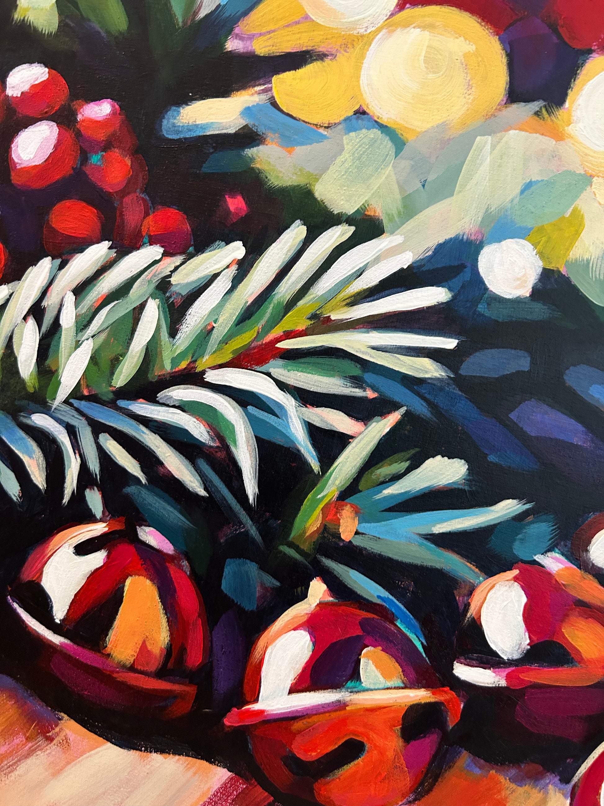 A festive acrylic painting capturing the warmth of the holiday season — bright red jingle bells, evergreen sprigs, and twinkling lights come together to evoke the cozy magic of Christmas.