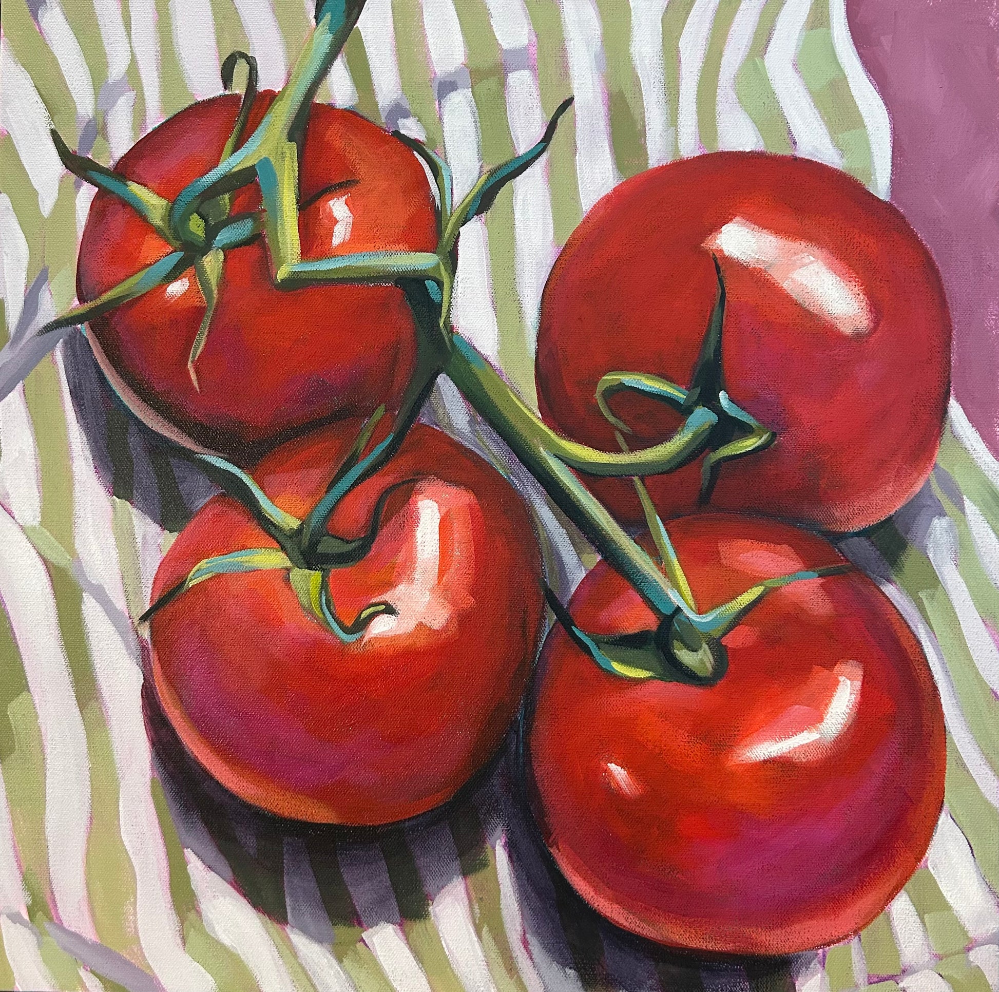 Vibrant still life painting featuring four ripe tomatoes on the vine, set against a striped fabric background. The bold colors and dynamic shadows bring a fresh, lively energy to this everyday subject.